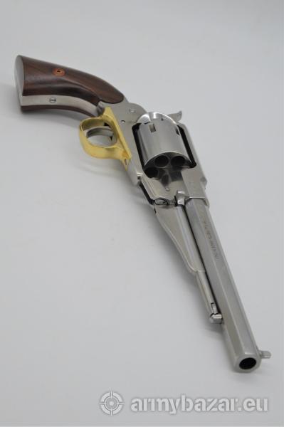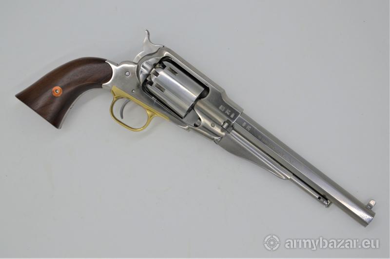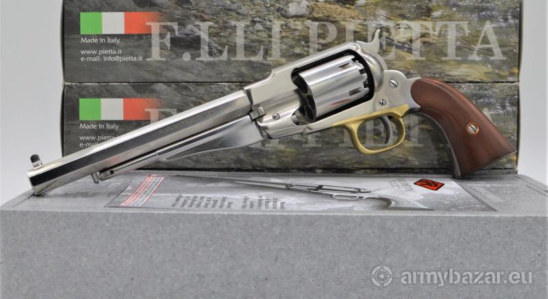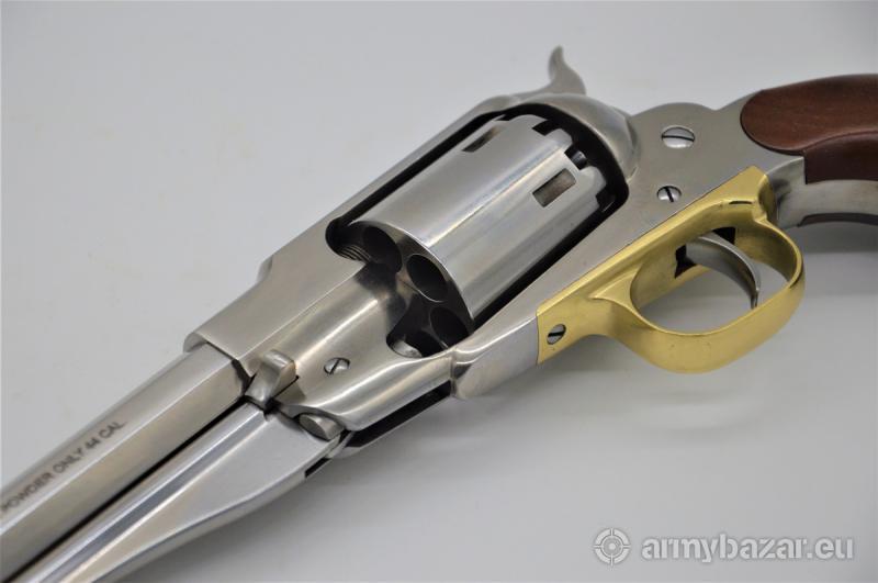 Opis: Nowy rewolwer czarnoprochowy rozdzielnego ładowania. 1858 Remington New Model Army Old Silver Kaliber: .44 Długość lufy: 8 cali Stal polerowana. Nie do odróżnienia od Inoxa. Jest to limitowana seria wypuszczona przez Piettę. Wysyłka DPD lub odbiór osobisty.