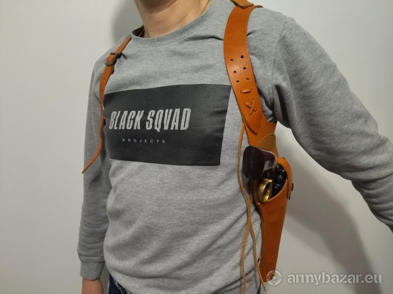 Opis: Nieużywana skórzana kabura z szelkami do rewolweru cp z lufą do 8". Mieści się zarówno Colt jak i Remington w wersji target (przyrządy nie utrudniają wkładania i wyjmowania broni).