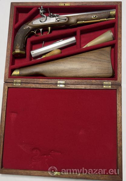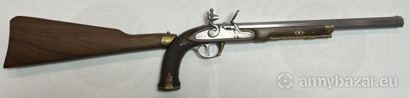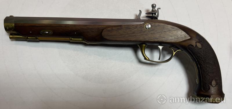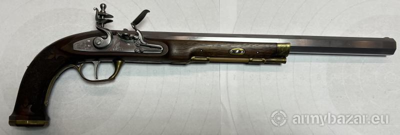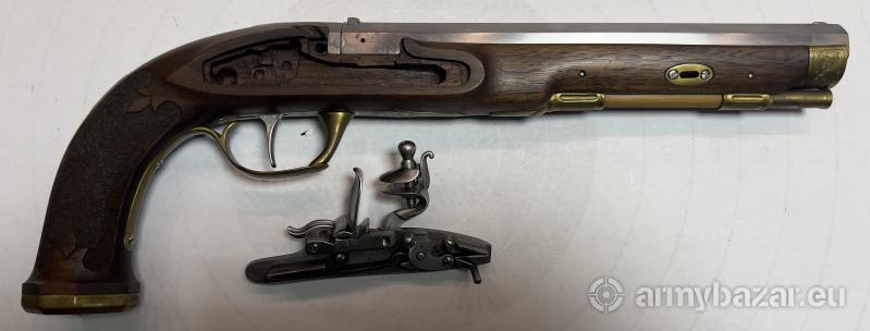 Opis: Pistolet skałkowy kal. 45 ZESTAW robiony na zamówienie. Ciekawe rozwiązanie konstrukcyjne broni czarnoprochowej skałkowej z dokręcaną kolbą i przedłużaną lufą. Całkowita długość broni to 38 cm przedłużka lufy + 16,5cm + kolba 35cm Lufa gwintowana, kaliber lufy 45mm. Pistolet wykonany jest ze stali wysokowęglowej z okuciami mosiężnymi i chwytem z drewna egzotycznego. Pistolet zrobiony jest przez człowieka, który wykonuje repliki wszelkiej broni czarnoprochowej od 35 lat, ze szczególnym naciskiem na zachowanie wierności historycznej oryginalnym egzemplarzom starej broni. www.arms.com.pl/pistolet-skalkowy-kal-45-zestaw-p-445.html