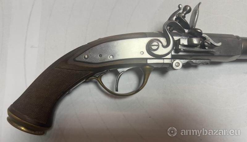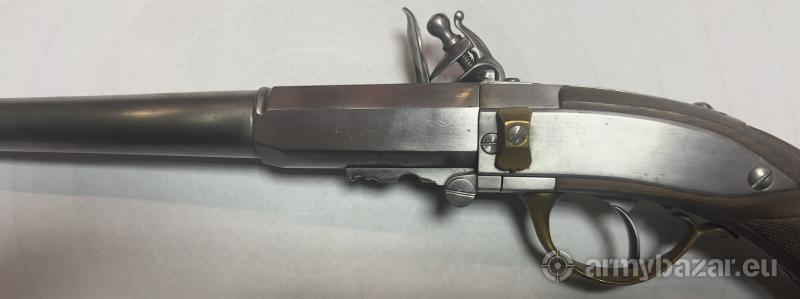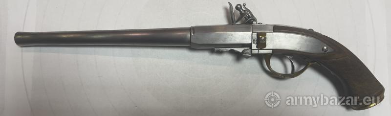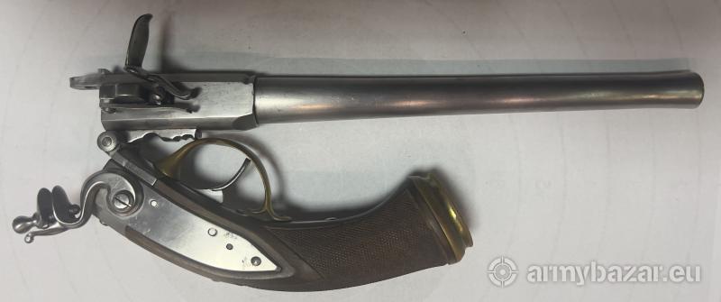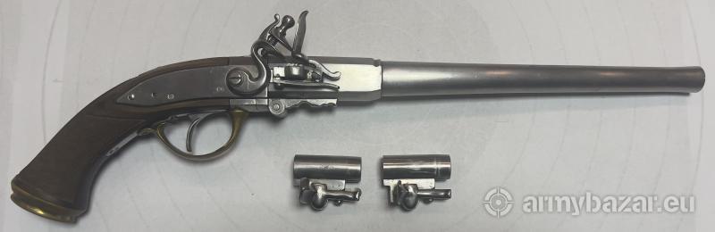Opis: Pistolet skałkowy z wymiennymi komorami ładującymi kal.12,7mm (3szt. komór ładujących) robiony na zamówienie. Ciekawe rozwiązanie konstrukcyjne broni czarnoprochowej skałkowej z wymiennymi komorami ładującymi. Na zdjęciach pistolet ładowany odtylcowo z zamkiem skałkowym o takiej konstrukcji konstrukcji. Całkowita długość broni to 48 cm. Lufa gwintowana, kaliber lufy 12,7mm. Pistolet wykonany jest ze stali wysokowęglowej z okuciami mosiężnymi i chwytem wykonanym z orzecha. Pistolet zrobiony jest przez człowieka, który wykonuje repliki wszelkiej broni czarnoprochowej od 35 lat, ze szczególnym naciskiem na zachowanie wierności historycznej oryginalnym egzemplarzom starej broni.