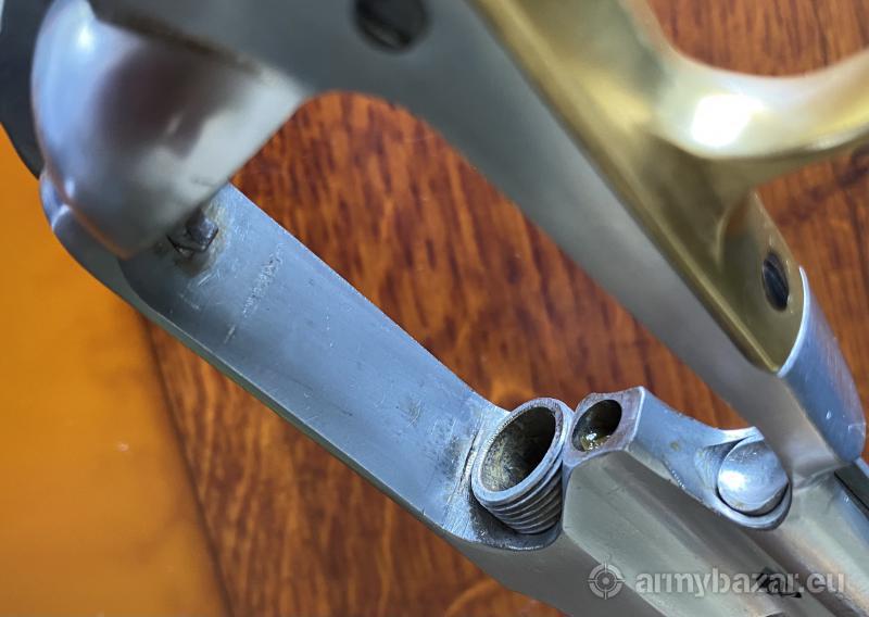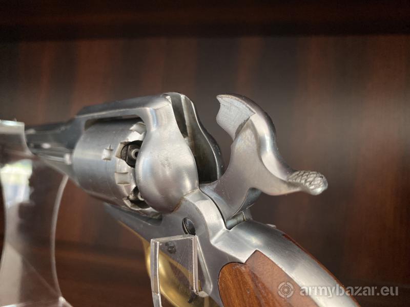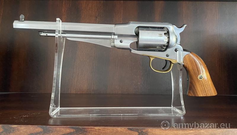 Opis: Remington Pattern CUSTOM. cal. 44, Lufa 8" Kapiszonowy rewolwer tarczowy wyprodukowany przez słynną firmę Pedersoli. Ten model został stworzony by spełnić wysokie wymagania strzelców tarczowych, polepszono parametry balistyczne lufy. Wyraźny, precyzyjny gwint, jak w broni nitro. Spust pracuje bardzo lekko. Bęben obraca się na tulei, jak na łożysku. Ogólna kultura pracy jak w szwajcarskim zegarku. Egzemplarz po 2 latach strzelania posiada delikatne ślady używania (ryski), bez uszkodzeń i wad. Zalecane kule .454.