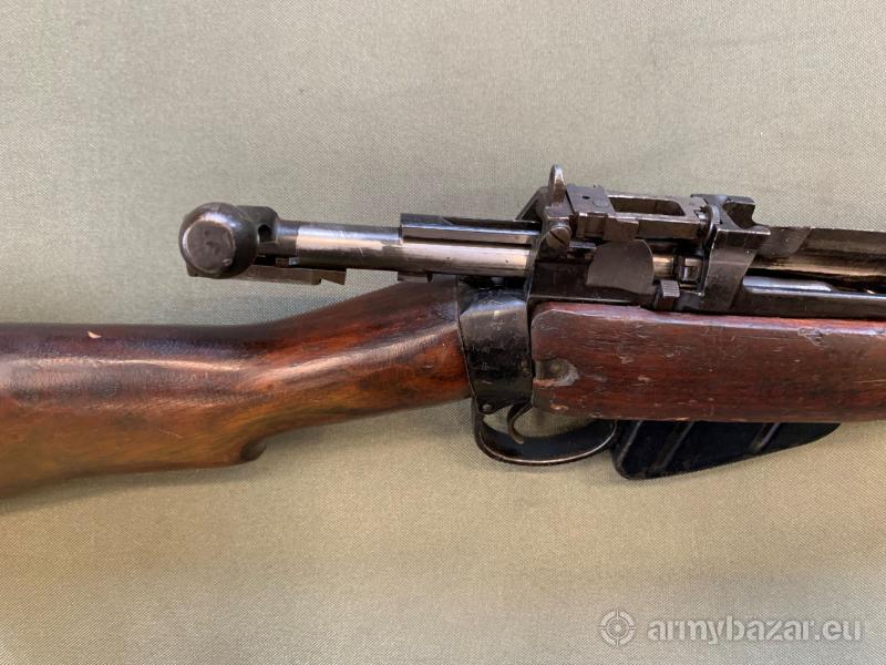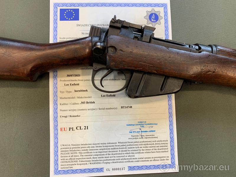 Opis: Karabin Lee Enfield. Broń pozbawiona cech użytkowych - deko według nowych norm EU z certyfikatem z CLKP. Broń pozbawiona cech użytkowych dostępna jest dla osób powyżej 18 roku życia bez pozwolenia, podlega jednak obowiązkowi rejestracji. Kupujący broń pozbawioną cech użytkowych zobowiązuje się do jej zarejestrowania we właściwym WPA KW Policji w terminie nieprzekraczającym 5 dni od daty wystawienia faktury która dołączona jest do broni. W przypadku zakupu broni w wersji deko (pozbawionej cech użytkowych) na istotnych częściach broni pojawią się dodatkowe oznaczenia CLK KGP (CL EU) potwierdzające pozbawienie cech użytkowych a także ślady koniecznych modyfikacji.